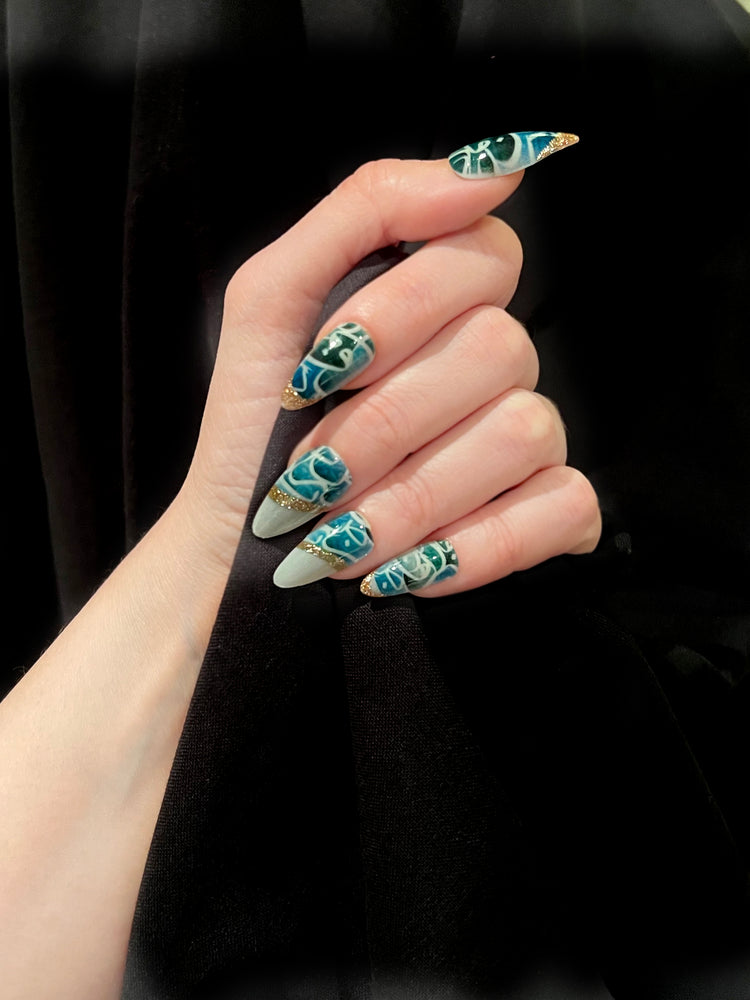 Miracle Art Salon Acrylic Nails Almond, 24 Pieces Blue Calligraphy AS24006